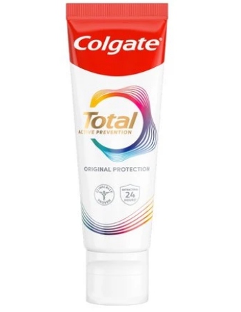 Особливості та властивості зубної пасти Colgate Total Original забезпечує 12-годинний захист від бактерій, ефективно бореться із захворюваннями ясен і зубів, щоденне застосування запобігає утворенню зубного нальоту. табличка