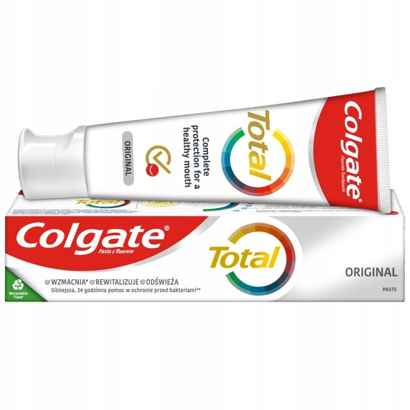 Colgate Total Original - це зубна паста, яка забезпечує комплексний захист ротової порожнини. Містить фтор, який захищає від карієсу і зміцнює зубну емаль. Зубна паста також містить інгредієнти з антибактеріальними властивостями, які борються з бактеріями, відповідальними за утворення зубного каменю, і запобігають неприємному запаху з дихання.