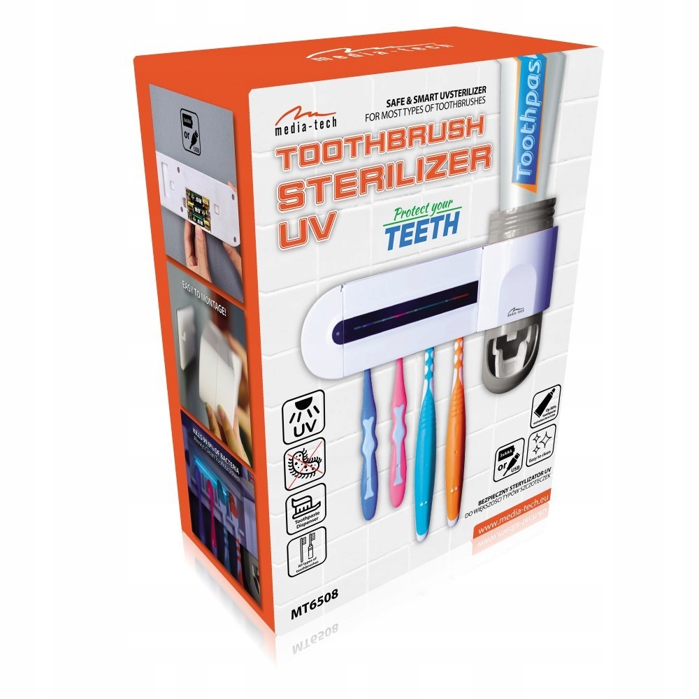 - СТЕРИЛІЗАТОР ЗУБНОЇ ЩІТКИ UV MT6508 – 3 в 1: органайзер та ультрафіолетовий стерилізатор для зубних щіток із дозатором зубної пасти.