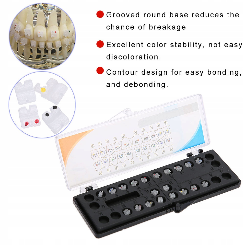 1. Виготовлений з високоякісної керамічної, нетоксичної та постійної у використанні. Ортодонтичні керамічні замки, тривала якість забезпечує стоматологи та пацієнти. Руйлена кругла основа знижує ризик перелому. Відмінна стабільність кольору, важке знебарвлення. Контурна структура, яка полегшує з'єднання та лущення.