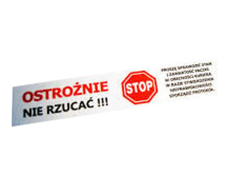 Ми продаємо стрічки для упаковки зі стандартним друком, призначеним для забезпечення відправлення та маркуванням необхідності перевірити їх вміст. Вони ідеально клеєні пакети, папір, фольга, коробки тощо. Він стійкий до вологи та низьких температур.