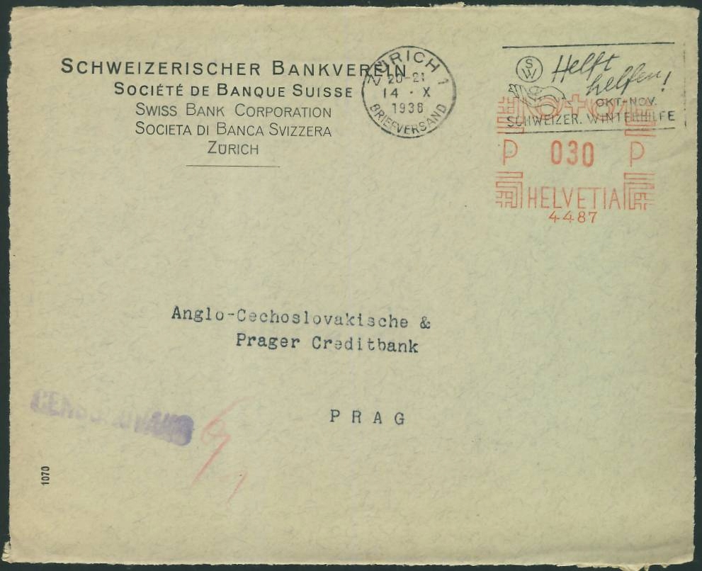 Zurich Bankverein 1938 - механічна франкатура/цензуровано