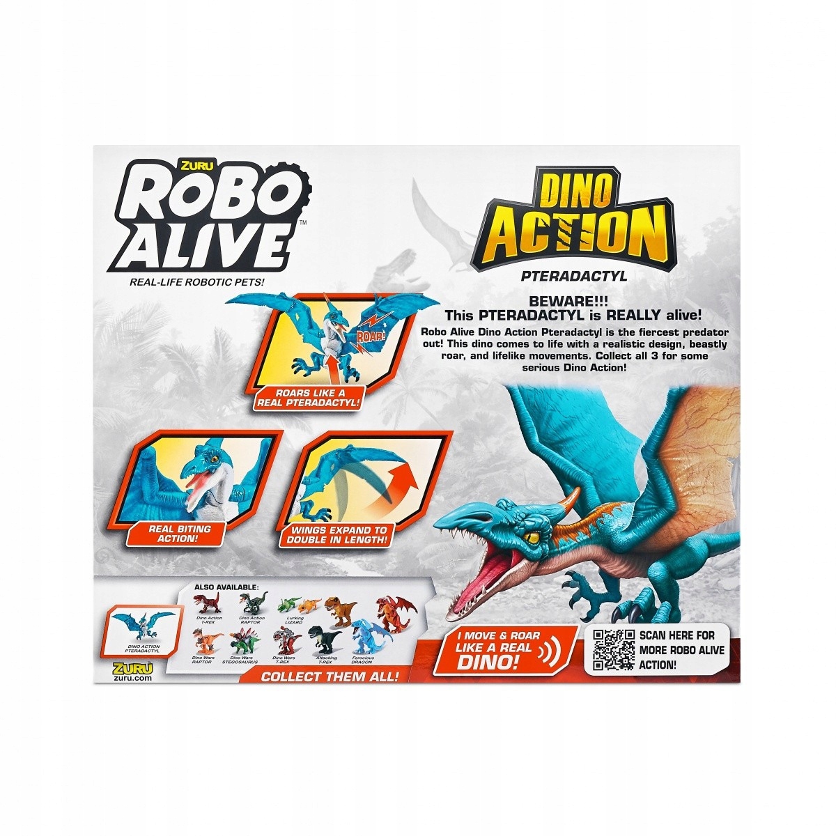 - Фігурка Robo Alive Dino Action — це блакитний Птеродактиль, який рухається, як справжній динозавр: він махає крилами, хапає здобич передніми лапами та клацає щелепою, як звір!