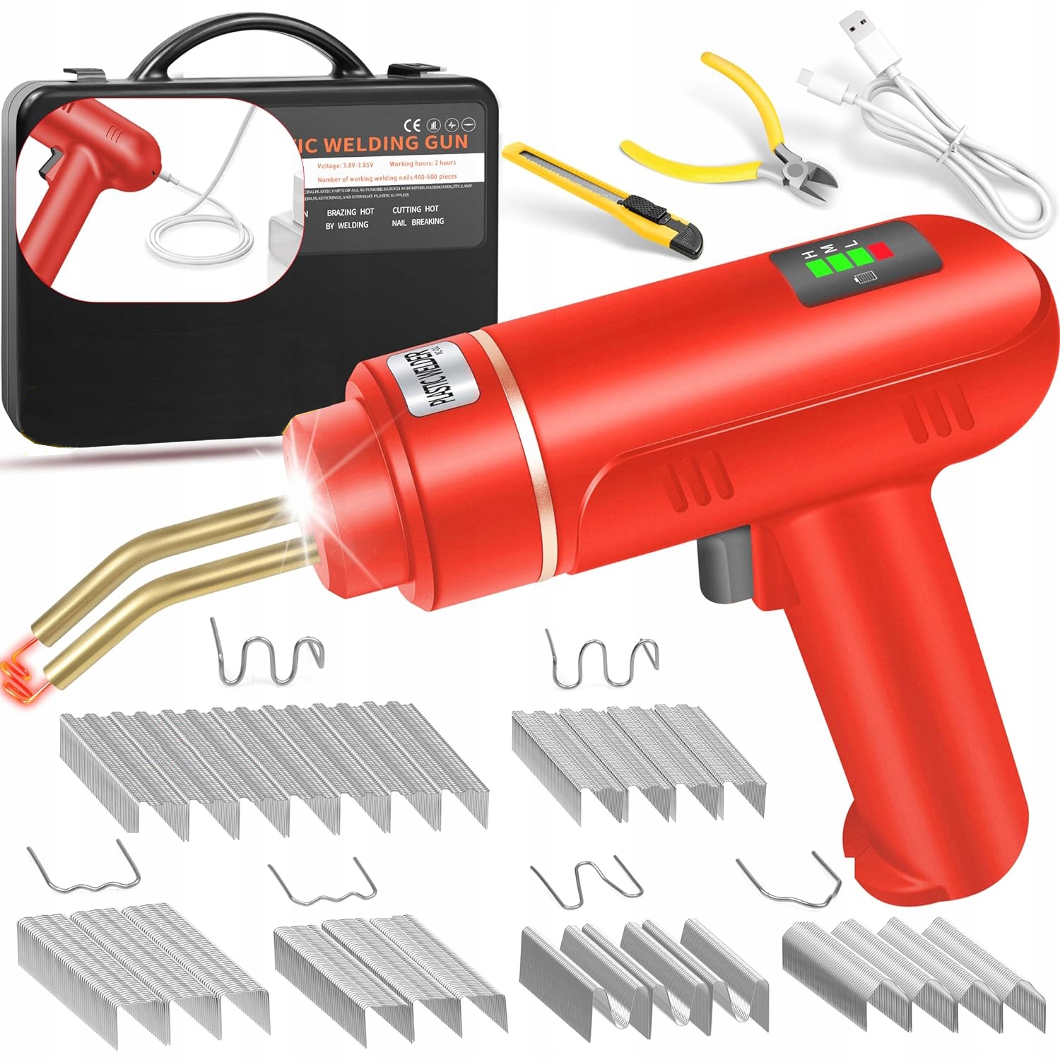 - Набір включає зварювальний апарат для пластику 200 Вт, велику кількість зварювальних цвяхів (1200 шт.), кабель для Передача даних Type-C довжиною 1 м, плоскогубці, ніж і футляр.