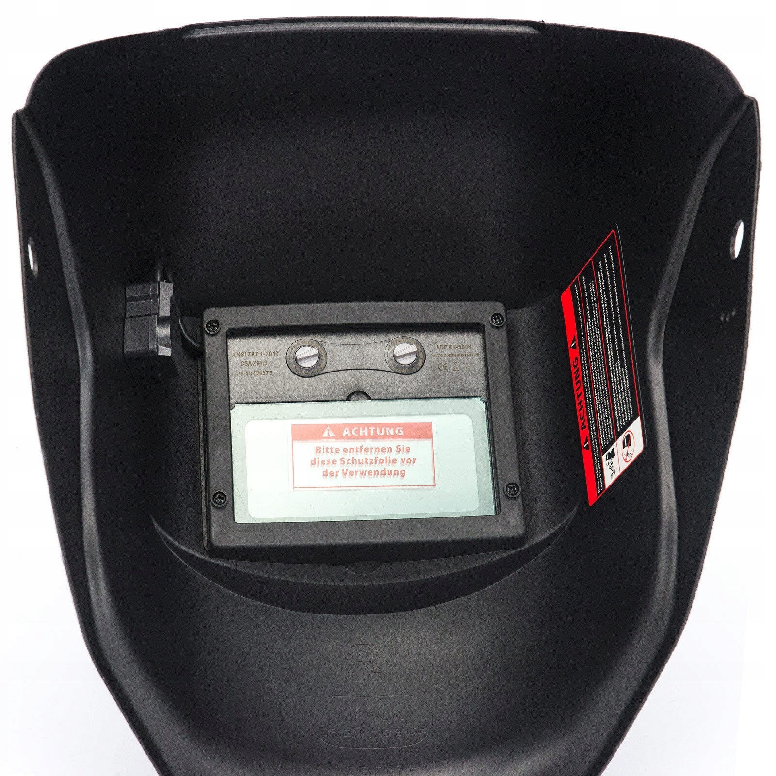 Захищає користувача від шкідливого випромінювання, що утворюється під час зварювання, а також від іскор і бризок. Спеціальний датчик, розміщений у фільтрувальній касеті, автоматично визначає початок процесу зварювання, активуючи функцію самозатемнення. Час відгуку становить лише 1/10000 секунди. Після завершення роботи фільтр автоматично повертається до стану освітлення.