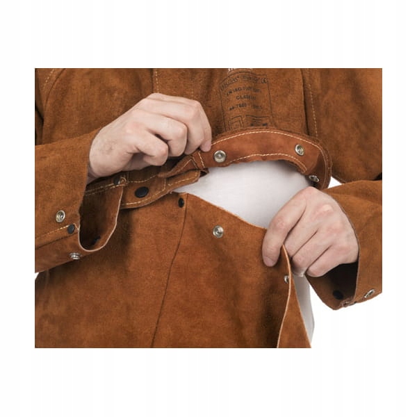 WELDAS Lava Brown™ бюст з рукавами – це зварювальний одяг для захисту рук і плечей. Виготовлений з міцної та гнучкої волової спилка. Шви подвійні прошиті дуже міцною, стійкою до високих температур 5-кратною ниткою KEVLAR®. Точки, що піддаються навантаженню, приклепані або додатково укріплені шкірою. Усі заклепки та засувки мають електроізоляцію. Болеро можна використовувати для різних зварювальних процесів, зокрема: MMA, MIG/MAG, TIG, мікроплазмового, точкового та газового зварювання, а також для плазмового та кисневого різання, різання та паяння.