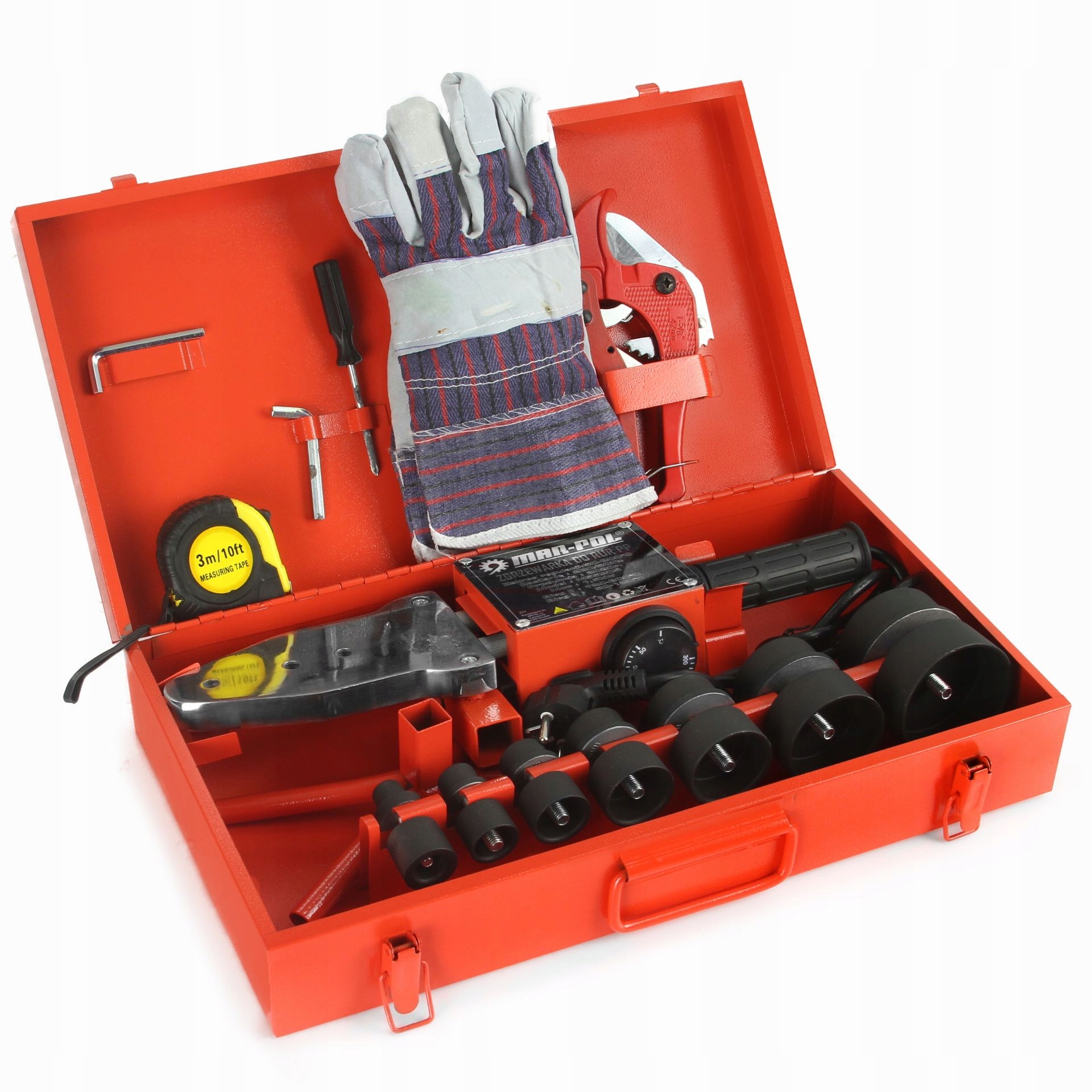 У набір входить 7 нагрівальних штифтів і муфт, що дозволяють працювати з трубами та фітингами діаметрів: 16, 20, 25, 32, 40, 50 і 63 мм. Муфти покриті тефлоновим покриттям, що забезпечує ще точніші з'єднання