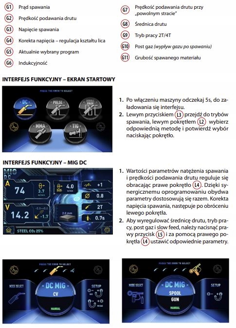 - Індуктивність - регулювання індуктивності зварювання - контроль ширини обличчя та глибини суміші (MIG/MAG), зменшення кількості бризок зварювання Зварювальна ручка, з вбудованою подальною подачею та котушкою в ручці (MIG/Mag), Hot Start - простіший електрод (MMA),