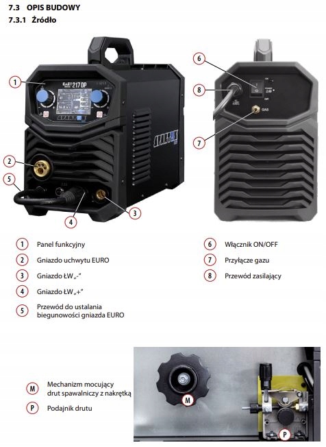 побудована двоколірна годівниця забезпечує стабільне введення зварювального дроту. Невелика вага та розміри роблять Easmig 217dp зручним зварювальним пристроєм. Простота використання та вдосконалені варіанти зварювання роблять Easymig 217dp ідеальним пристроєм як для промислових установок, так і для семінарів.