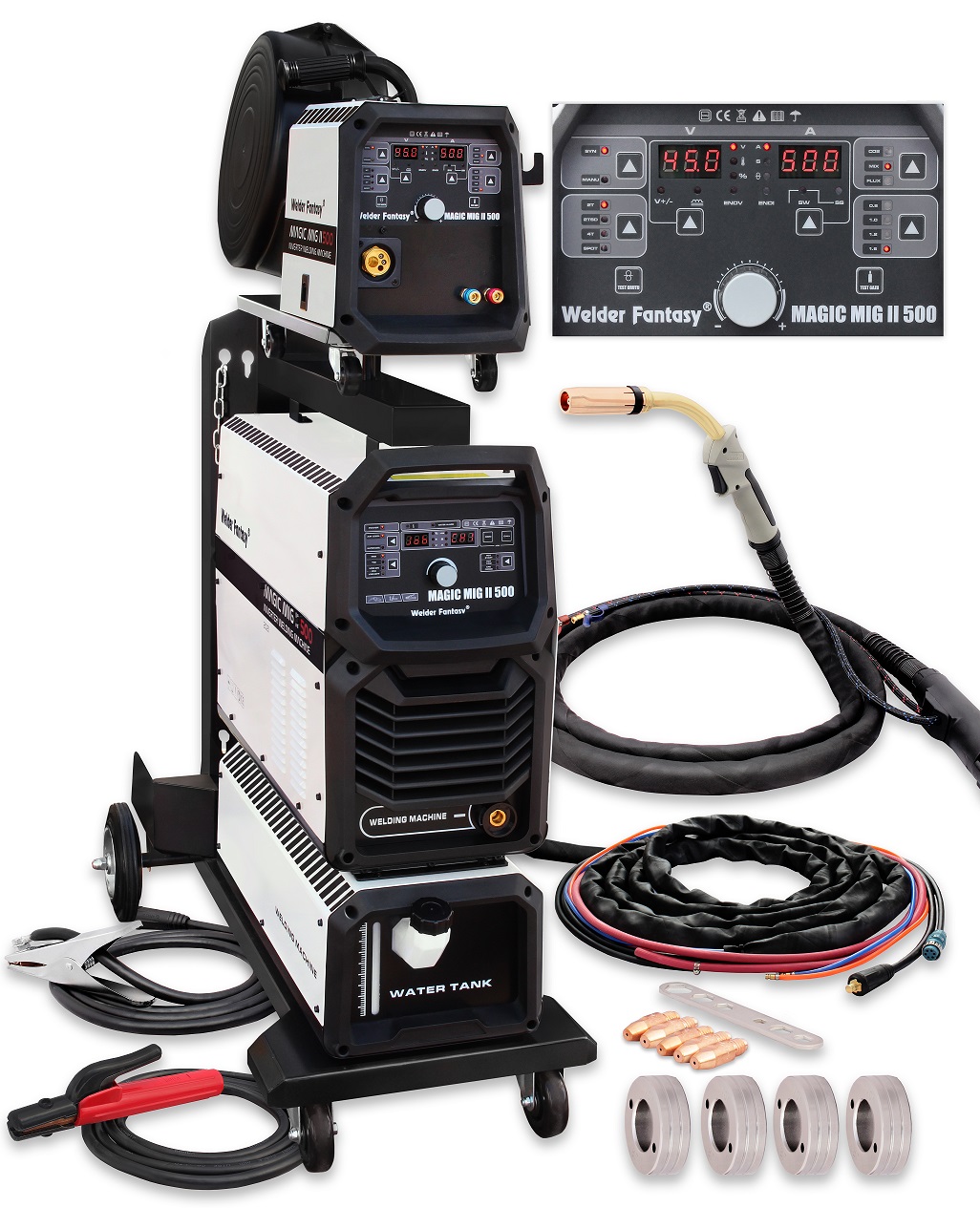 Багатофункціональний інверторний зварювальний напівавтомат Welder Fantasy MAGIC MIG II 500 БАШТА обладнанаохолоджувачем та окремим 4-х рулонним механізмом подачі дроту. Застосування рукоятки з рідинним охолодженням значно підвищує комфортність роботи та продовжує термін служби витратних матеріалів і самої рукоятки.
