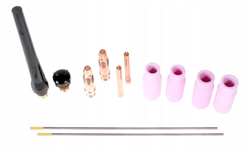 Додатково до рукоятки пропонуємо 2 повних універсальних набори аксесуарів для зварювання електродом діаметром 1,6 мм та 2,4 мм. У комплект входить: електрод, затискна втулка, струмовий з'єднувач, 4 газокерамічні насадки, 2 заглушки.