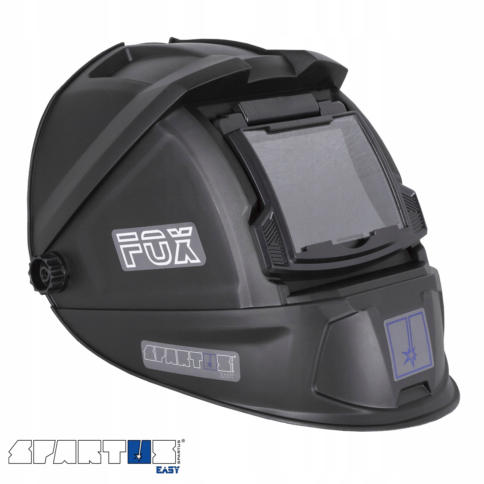 Пасивна зварювальна маска з клапаном SPARTUS Easy FOX. Призначений для захисту очей і обличчя зварника від шкідливого випромінювання та бризок під час зварювання. Призначений для використання при дуговому зварюванні та плазмовому різанні. Підйомна кришка з фільтром дозволяє швидко переглядати без необхідності знімати козирок. Він має внутрішнє прозоре захисне скло, що робить його також придатним для шліфування.