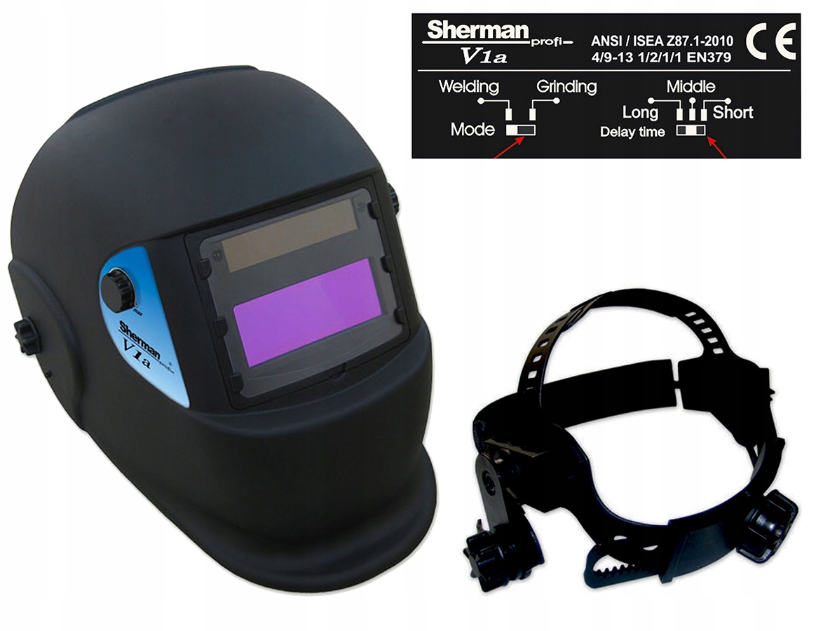 Автоматичний зварювальний шолом Sherman V1A призначений для захисту ваших очей і обличчя від іскор, бризок і шкідливого випромінювання під час зварювання та шліфування. Фільтр автоматичного затемнення автоматично змінює світлий колір на темний після запалювання дуги та знову стає світлим після зварювання. Козирок має дві зовнішні ручки, що дозволяють регулювати ступінь затемнення від 9 до 13 по DIN і плавно регулювати чутливість реакції фотодатчиків на інтенсивність дуги під час зварювання. На внутрішній панелі управління є два перемикача, які дозволяють трипозиційно регулювати час затримки перемикання темного/світлого стану та зміни режиму роботи. Затемнювальний фільтр оснащений двома фотосенсорами.