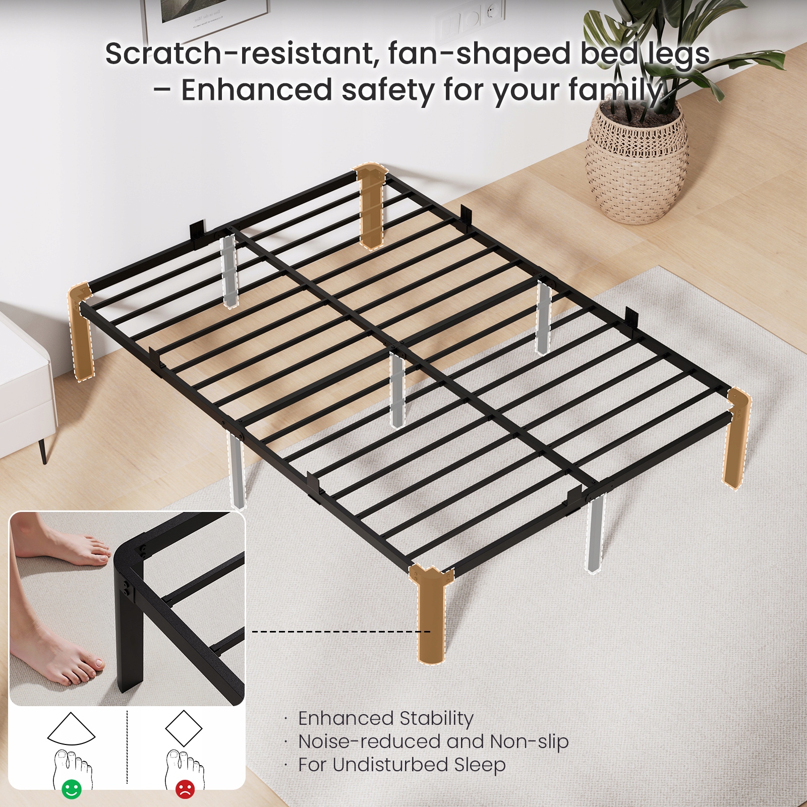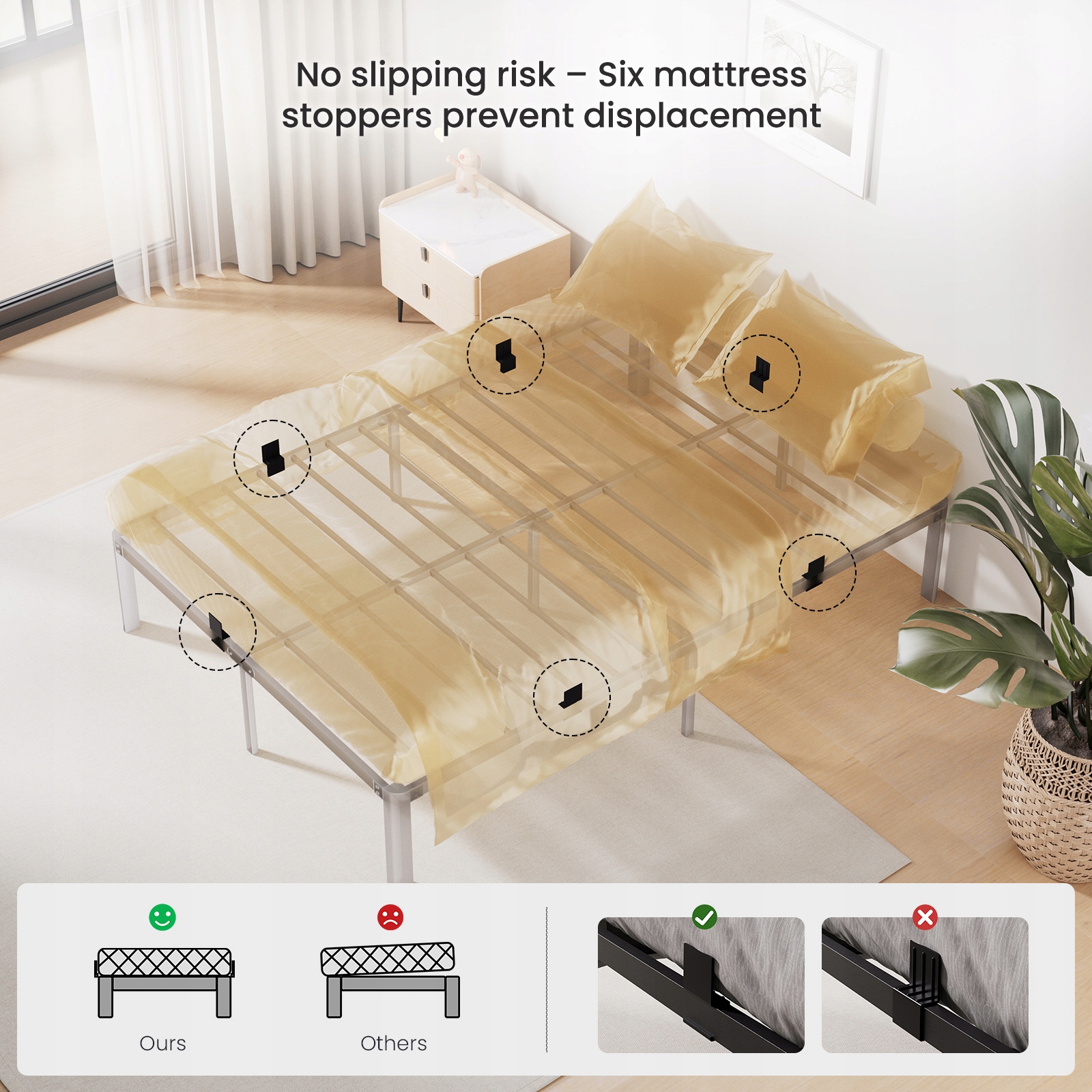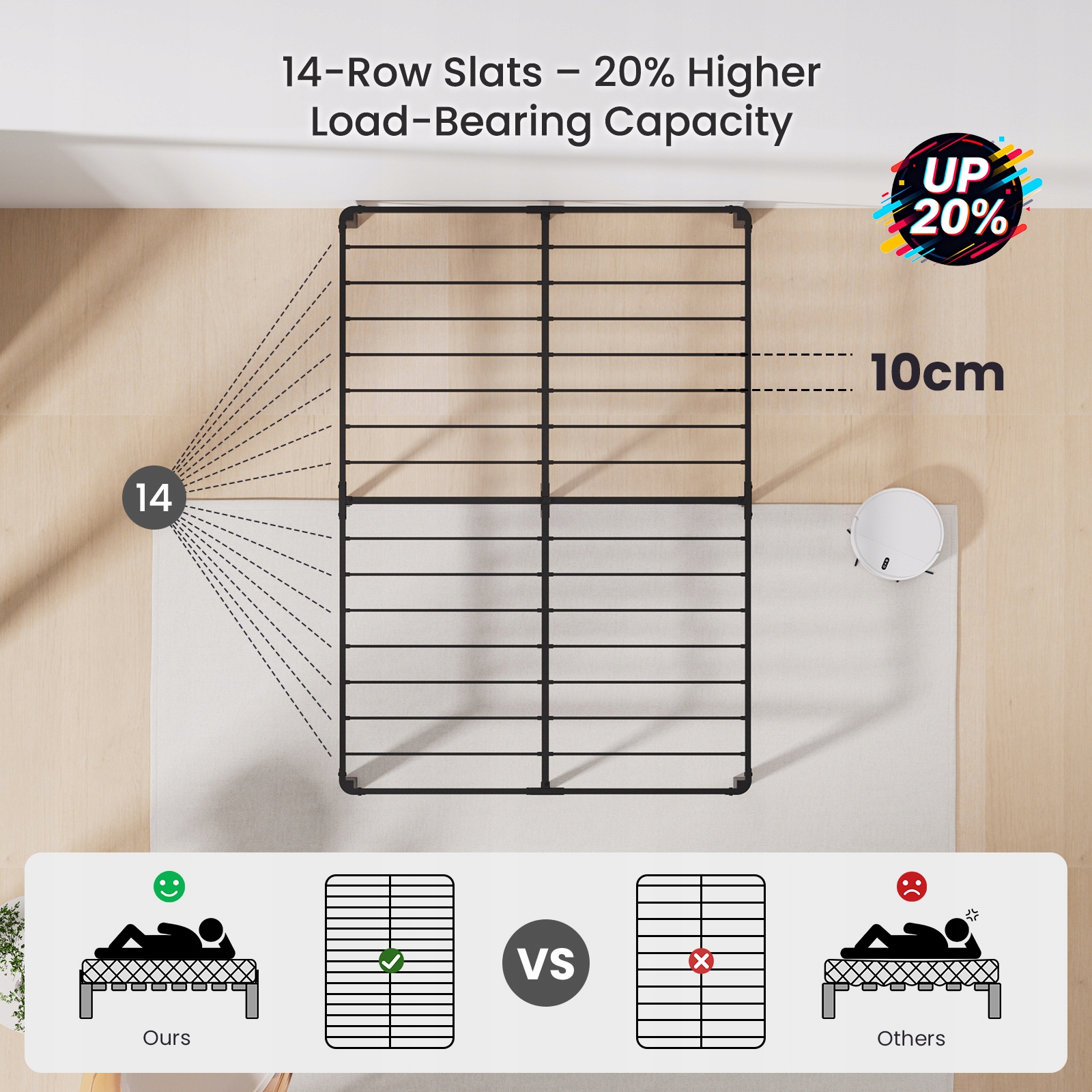 3. Надійна конструкція: цей каркас ліжка має 14 рядів міцних металевих планок приблизно на чотири дюйми одна від одної для виняткової підтримки, усуваючи потребу в пружинному матраці. Цей міцний металевий каркас двоспального ліжка витримує до 800 фунтів для довговічності.
