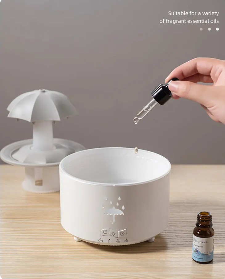 Натхненний дощовою погодою, цей унікальний зволожувач створює чарівний ефект падаючих крапель, які м’яко циркулюють, не розбризкуючи воду. Він випромінює заспокійливий звук, що нагадує легкий дощ, а його тонке обертання в поєднанні з м’яким світлодіодним світлом забезпечує глибоке розслаблення – ідеально підходить для читання, медитації чи спокійного сну.