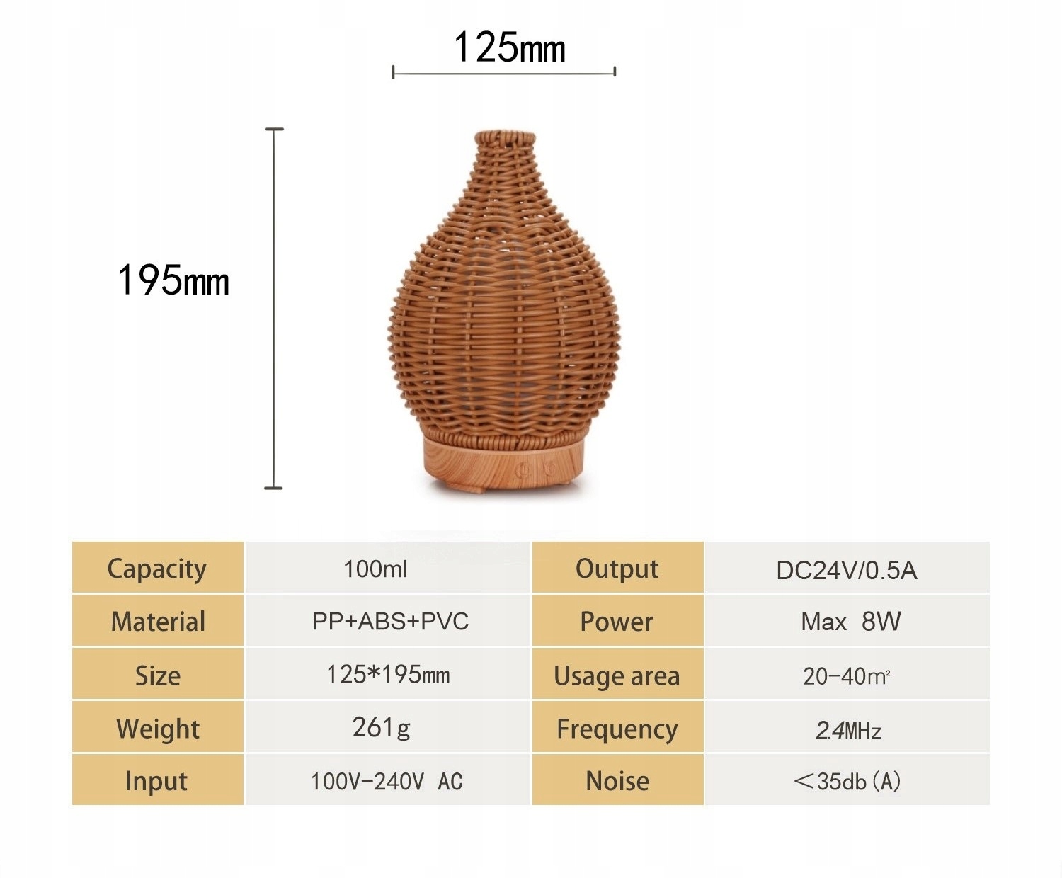 Сучасний дизайн у формі "вази"! Обладнання дуже функціональне та корисне. Він добре працюватиме як влітку, так і взимку. Дифузор полегшує наслідки: синусит, сухість у роті, очах, носі та шкірі. Він використовується для підтримки відповідної вологості та оновлення якості повітря. Має функцію ароматерапії (після додавання кількох крапель олії у воду простір наповнюється ароматом і створює атмосферу відпочинку). Зволожувач повітря також послужить Вам як красива прикраса. Це виглядає дуже ефектно, коли він працює і коли він тимчасово вимкнений.