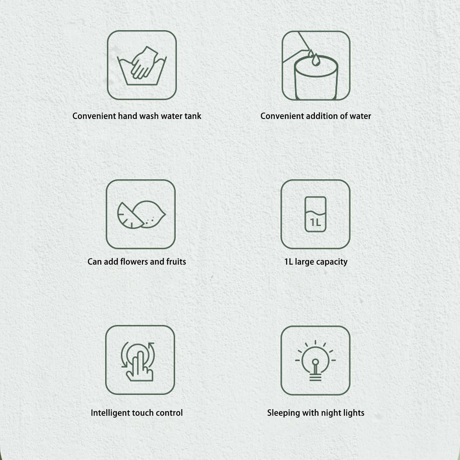 1. Резервуар для води 1 л: зволожувач має резервуар для води 1 л, який безперервно зволожує протягом тривалого часу, задовольняючи потреби домашнього та офісного використання.