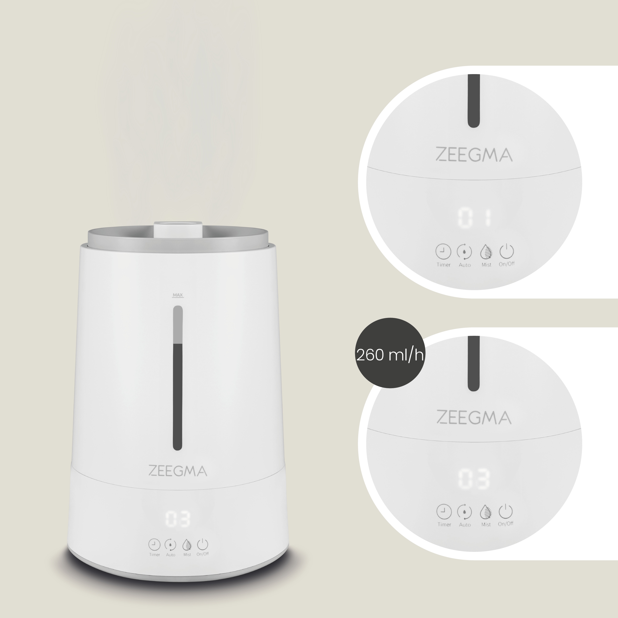 Zegma Vers Ioni дає вам можливість вибирати з чотирьох режимів зволоження, які можна адаптований до ваших потреб: низький, середній, високий і автоматичний режим.
