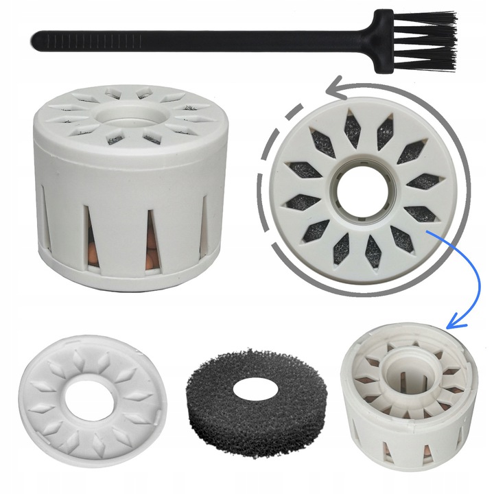 - Фільтр в комплекті з пропонованим нами зволожувачем не потребує заміни. Фільтр двоступеневий, перший - губчастий. а другий – керамічний фільтр. Коли фільтр забрудниться, просто розберіть його, повернувши верхню кришку фільтра ліворуч. Губчастий фільтр слід помити миючим засобом, наприклад рідиною для миття посуду. Для керамічного фільтра просто видаліть вапняні відкладення за допомогою лимонної кислотияк це робиться у випадку з чайниками для кип’ятіння води.