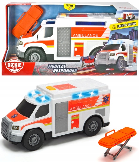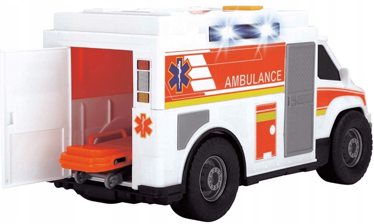 Швидка допомога від бренду Dickie Toys — мрія багатьох шанувальників автомобілів. Автомобіль оснащено звуковими та світловими функціями, щоб найкраще імітувати справжній рятувальний автомобіль. У його багажнику є помаранчеві носилки, які можна розкласти або скласти та покласти назад у автомобіль. Діти з раннього дитинства дізнаються, наскільки важливою є роль екстрених служб, і завдяки цій іграшці у кожної дитини зростає усвідомлення необхідності допомагати іншим.