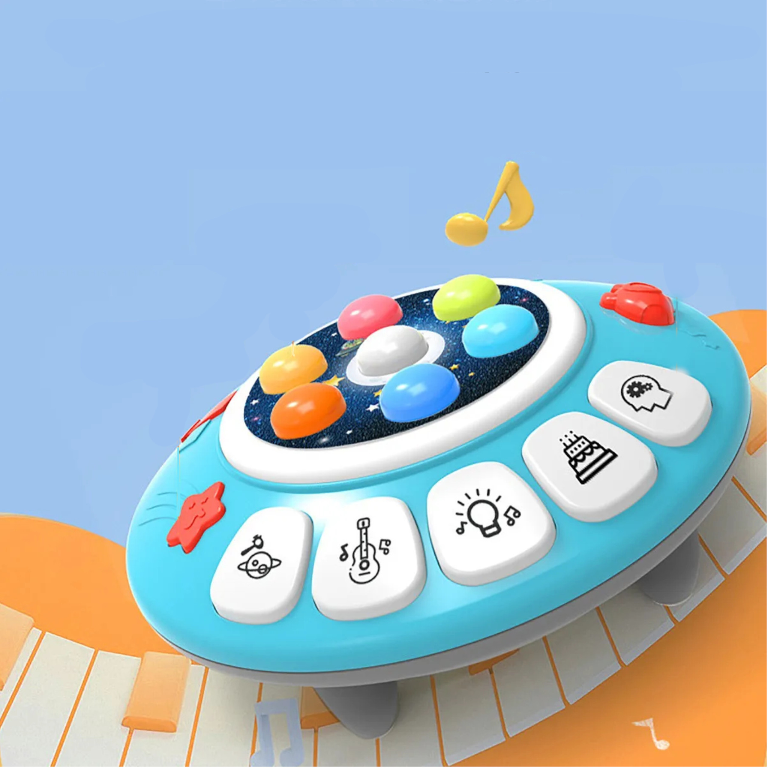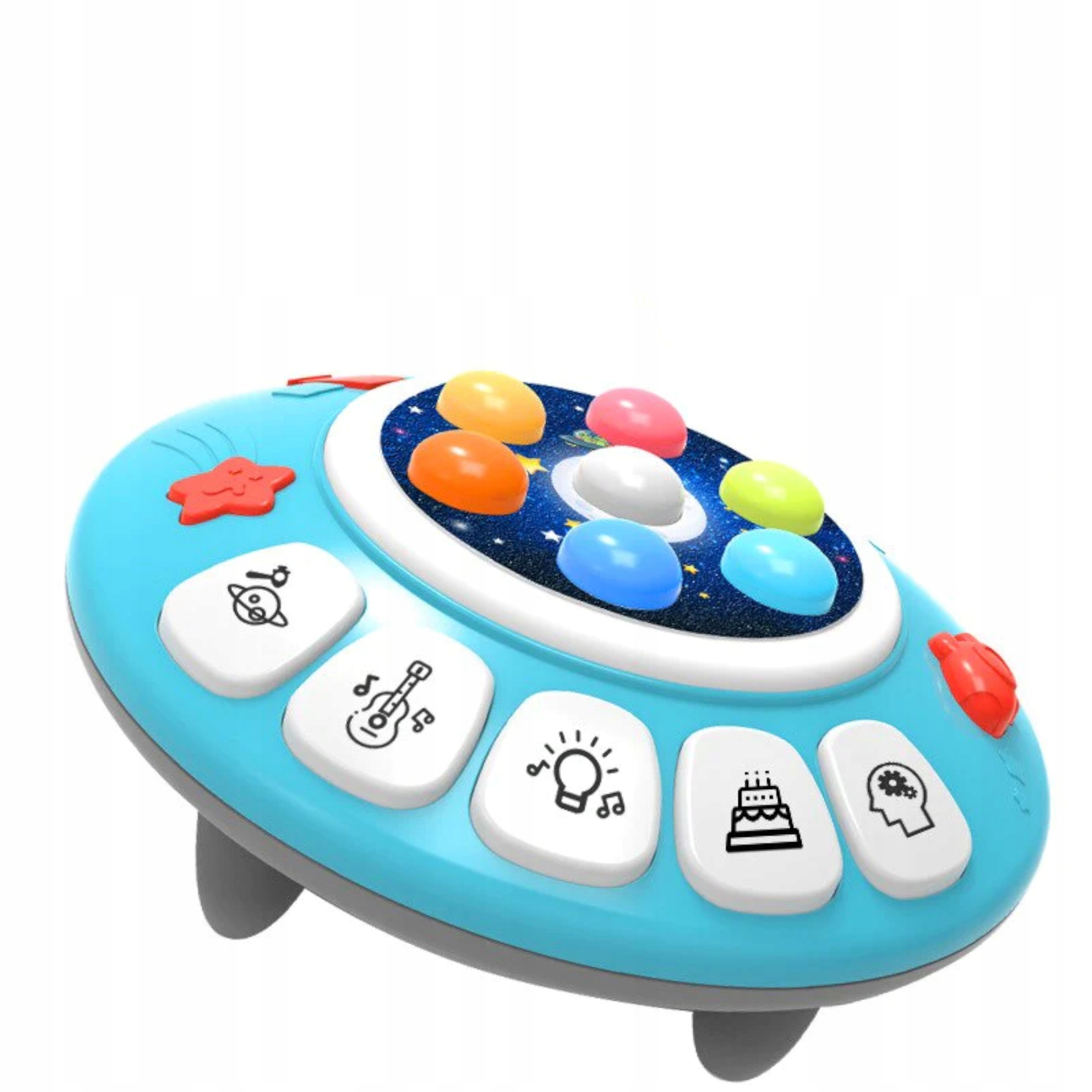 - Аркадна гра «Доджбол» «Насолоджуйтесь звуками космічного корабля» Гра «Насолоджуйтесь космічним кораблем» — це ідеальна іграшка, яка розвиває ручні навички вашої дитини та сприйняття рук. відносини. Іграшка призначена для дітей від 18 місяців. Цікавий візерунок космічного корабля і красиві кольори додатково привернуть увагу вашої дитини Розміри упаковки: 23 x 20 x 8,5 см. Розміри іграшки: Діаметр: 20,5 см. Висота: 7 см. Діаметр кольорових пуансонів: 2 см. Розміри молотка: 13 x 7.5 x 4.5 см. Батарейки : 3 x AA (не входить в комплект) Вік: 18 м + Іграшка має сертифікат EN71, CE. У набір входить: Насолоджуйтесь ігровим космічним кораблем. Функції молотка: гра передбачає натискання молотком на маленькі кнопки, які підсвічуються в певний момент. Гра починається після перемикання кнопки ON/OFF. Космічний корабель має двоступеневе регулювання гучності, що робить іграшку приємною на слух і для дорослого, який супроводжує гру. Відразу після включення іграшки нас вітає весела, жвава мелодія, розвивайте мануальні навички і пам'ять дитини, вчіть її проходити всі рівні складності! Дошка має 7 шт Красиві різнокольорові кнопки, які підсвічуються по черзі, і по них потрібно бити молотком, є спеціальне місце для зберігання молотка, і іграшка має три кнопки з мелодіями: у формі космічного корабля, у формі пляшки та у формі зірки. Після натискання кнопки корабля ми почуємо пісню, яка виконується англійською. Коли пісня продовжується, кнопки по черзі світяться, а щит навколо кнопок блимає. Наступна мелодія викликається повторним натисканням кнопки. Після натискання зірочки на піаніно звучить короткий музичний твір. Цей ефект супроводжується чергуванням світла на ободі кнопок. При натисканні на пляшку ви почуєте 3 заспокійливі мелодії. Під час відтворення мелодії кнопки та обідок заспокоюють по черзі. Наступна мелодія викликається повторним натисканням кнопки. Крім того, космічний корабель має 5 кнопок, кожна з яких активує окремий режим: кнопка з планетою та молоточком активує режим, у якому дана кнопка світиться, і дитина повинна натиснути на неї відповідним чином. Якщо ми правильно натискаємо 15 кнопок, лунає мелодія, яка нас винагороджує. Однак, якщо ми пропустимо чотири кнопки поспіль, ми почуємо короткий звук, який вказує на несправність. Кожного разу відповідний звук вказує, потрапили ми в потрібний колір чи ні. Після виграшу або програшу гра відновлюється - ви можете грати нескінченно! Кнопки підсвічуються, і їх натискання додає ефект гітари. Завдяки цьому ваша дитина легко засвоїть основи ритму. Наприкінці, коли ваша дитина грає свою версію мелодії, гра пропонує гарне рішення, щоб дитина могла вчитися на своїх помилках. Неправильне натискання клавіші призводить до того, що ми чуємо мелодію з самого початку. Звуки супроводжуються світяться обідком з лампочкою, який активує режим веселої музики, в якому кнопки і обідок світяться по черзі. У цьому режимі ми просто слухаємо 2 веселі мелодії, а четверта клавіша з зображенням торта активує 2 популярні мелодії. У цьому режимі також підсвічуються кнопки і обідок. Щоб запустити другу мелодію, потрібно ще раз натиснути останню кнопку з головою. Спочатку гра показує нам 1 кнопку, і ми повинні натиснути її молотком. Гра показує нам два режими: в першому ми приходимо