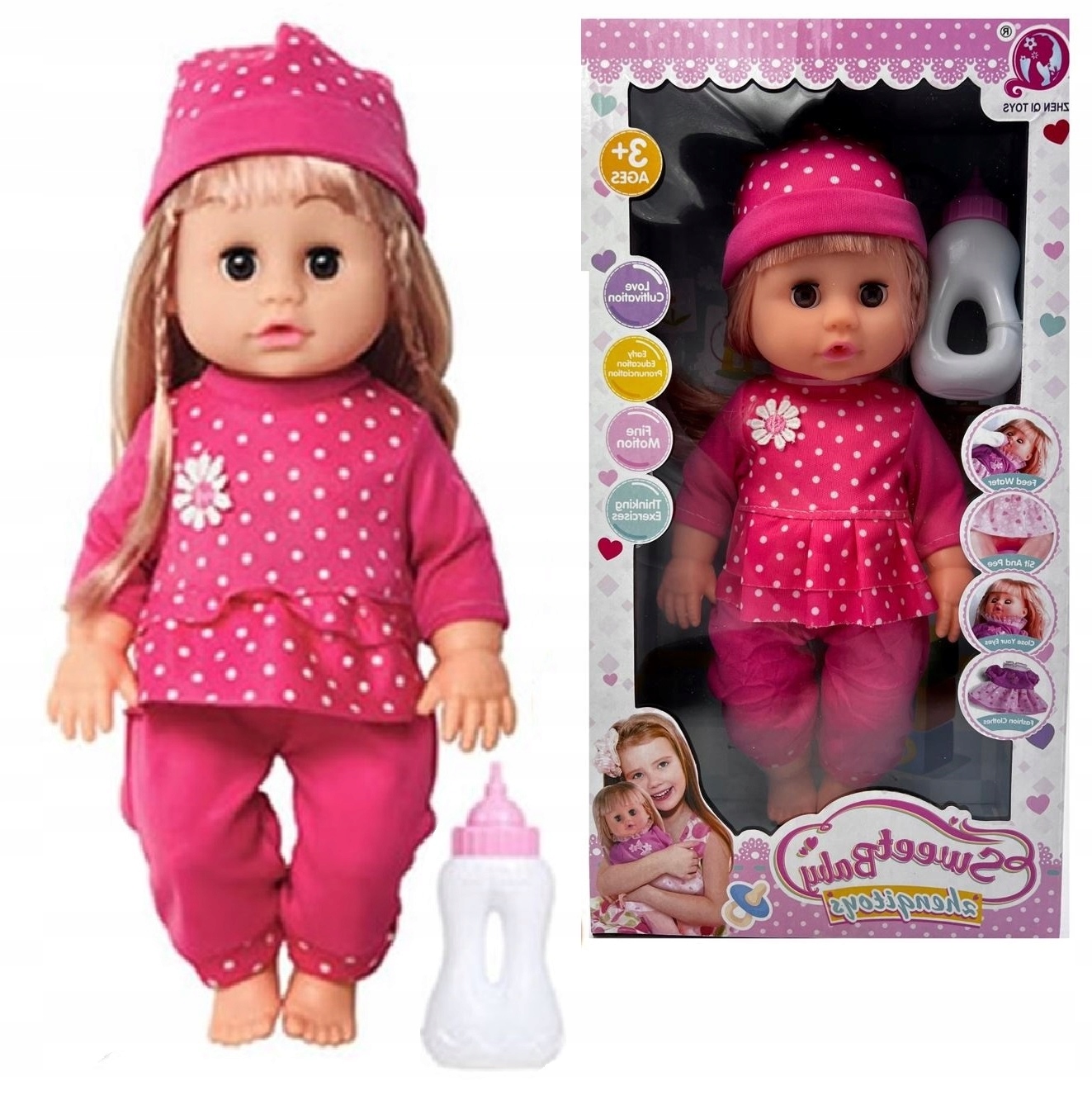 У ляльки є трубка всередині її тіла, ви можете налити трохи води в пляшку, лялька "пісяє" після того, як її випить , що дозволяє навчитися турботі, відповідальності та виховує співчуття до інших людей у вашій дитині.
