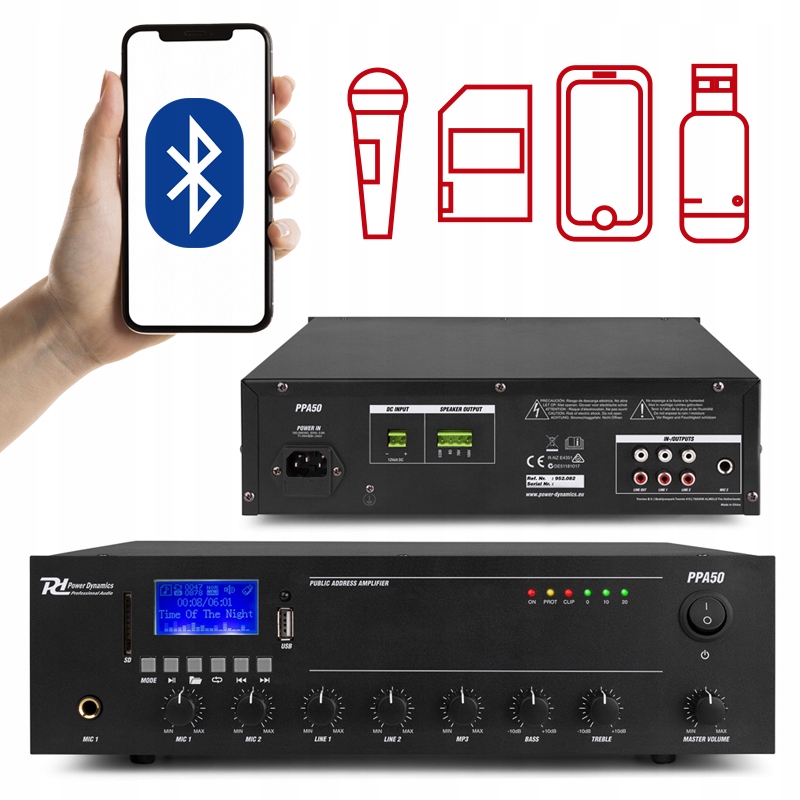 Power Dynamics PPA50 — це 100 Вт підсилювач потужністю 50 Вт. Це робить його ідеальним для невеликих фонових систем або систем оповіщення, наприклад, у магазинах, закусочних, залах очікування тощо. Підсилювач оснащений Bluetooth для бездротової передачі аудіо, наприклад, з телефону або планшета. Також є mp3 плеєр. MP3-плеєр навіть поставляється з пультом дистанційного керування. Підсилювач також має 2 лінійних входу RCA і 2 мікрофонних входу (6,3 мм). Це дозволяє використовувати PPA50 як для музичних, так і для звукових систем (або їх комбінації).
