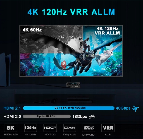 - Справжній відео- та аудіоформат 8K Ultra HD VRR ALLM】 - Формат відео: екстрактор HDMI 2.1 підтримує різні роздільності до 8K@60Hz, 4K@120Hz, 5120x1440@120Hz, 1080P@240Hz 4:4:4 8 біт. Також підтримує VRR, ALLM, HDR10, HDCP2.3, Dolby Vision, 3D-ефект. Аудіоформат: підтримує ARC, Dolby Atmos, DTS X, Dolby True HD, DTS-HD Master Audio, PCM7.1.