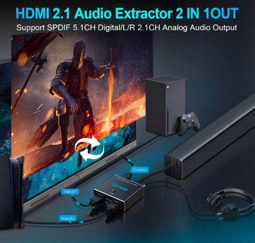 - Аудіоекстрактор HDMI 2.1 із 2 портами 2 до 1 дозволяє легко обмінюватися відео та аудіо з 2 різних джерел HDMI на одному дисплеї HDMI. Ви можете легко підключити зовнішні динаміки, підсилювачі, звукові панелі та приймачі до вашої кіно/ігрової системи через порти HDMI (аудіо 7.1 CH)/оптичні/3,5 мм. Підтримує перемикання за допомогою ІЧ-пульта дистанційного керування та CEC, забезпечуючи плавні переходи між пристроями.