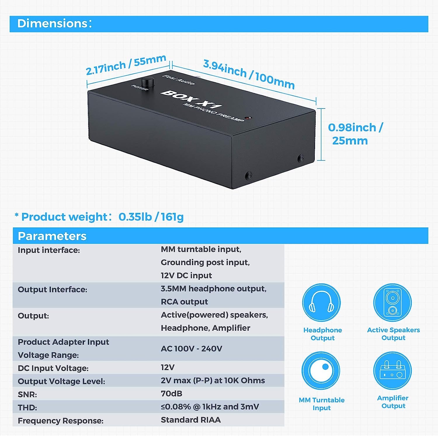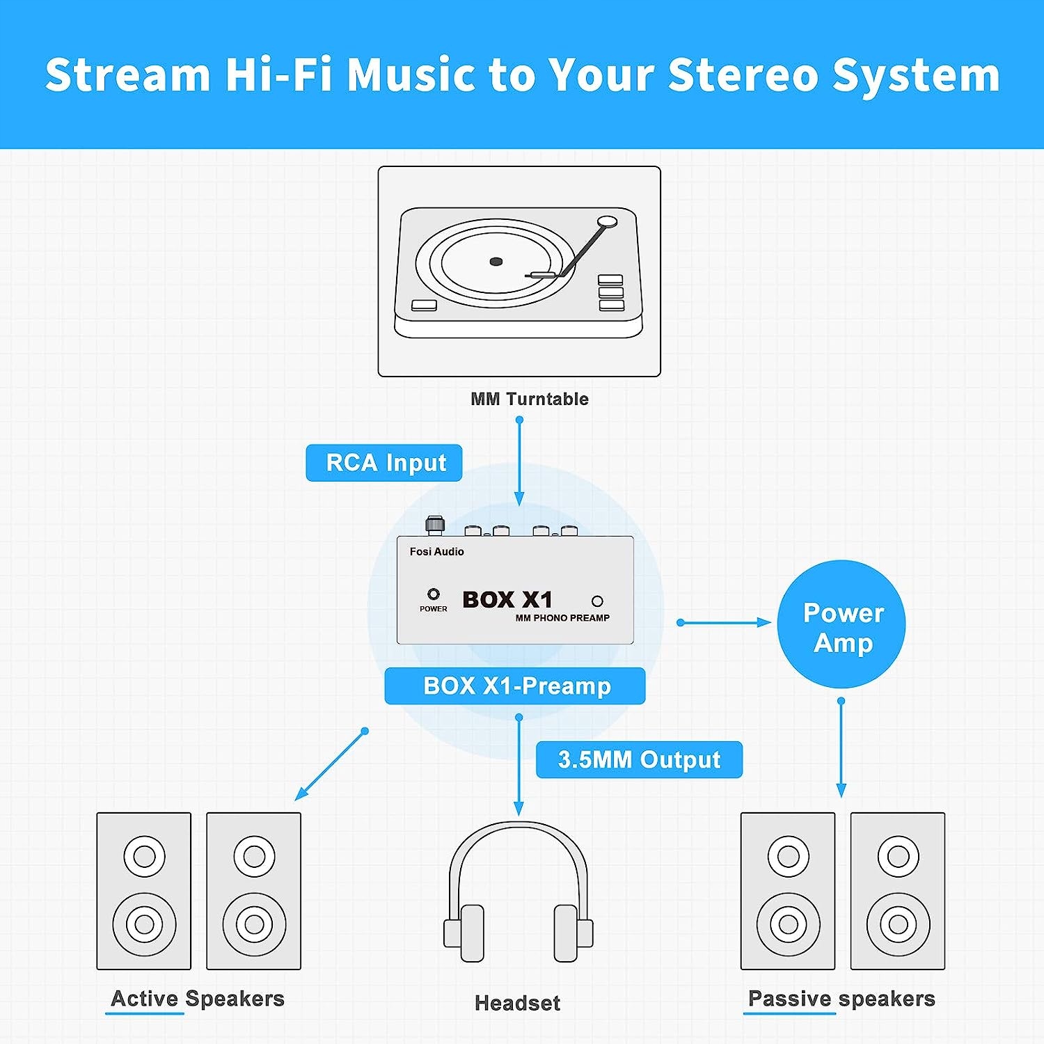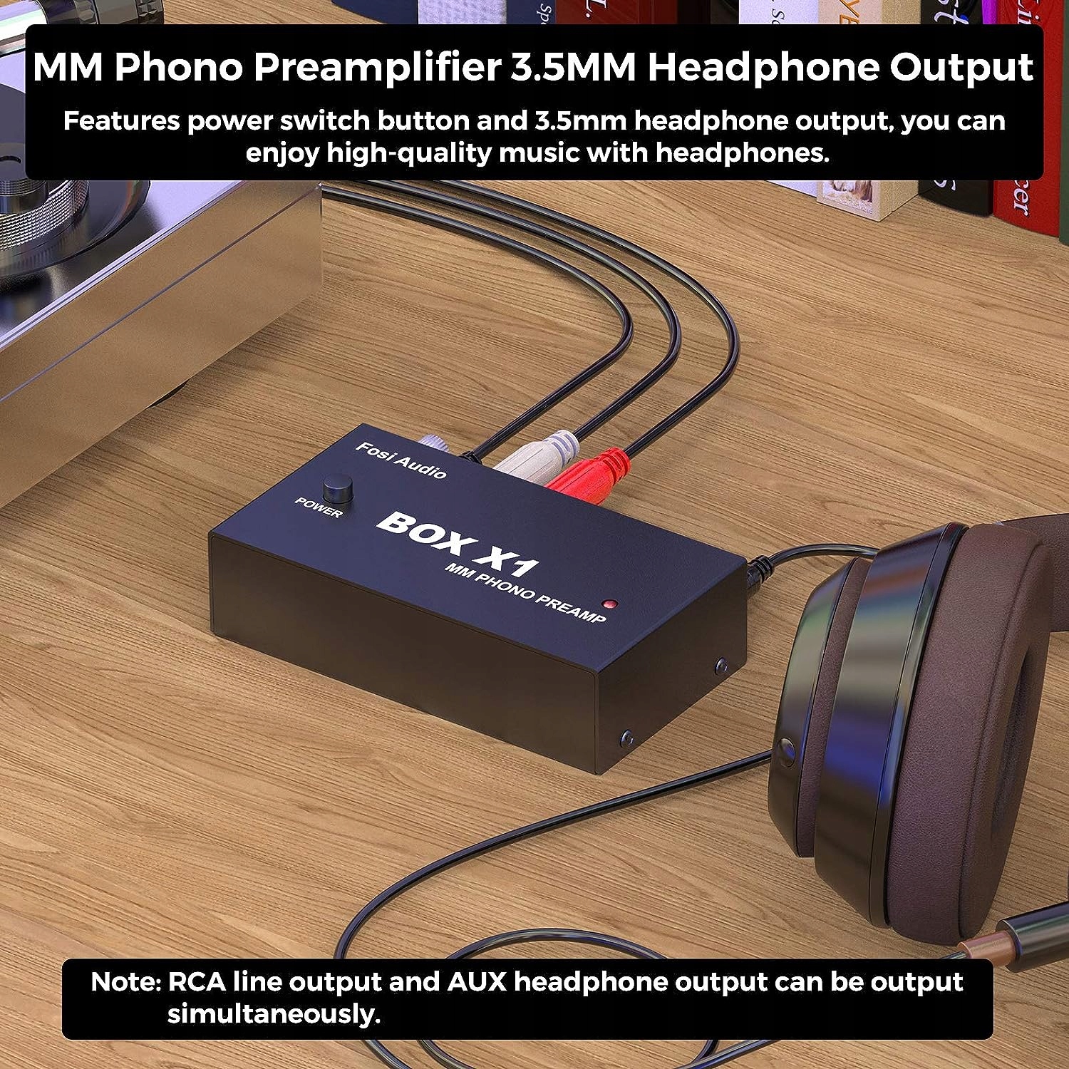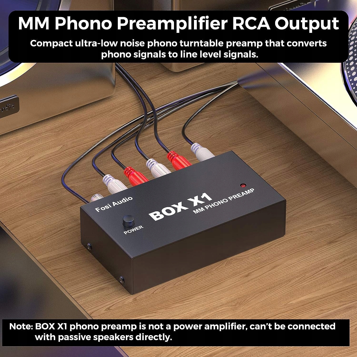 BOX X1 підтримує вхід для вертушки MM, вихід для навушників 3,5 мм і лінійний вихід RCA для активних колонок. Примітка. Ви можете підключити підсилювач потужності через вихід 3,5 мм або RCA, а потім підключити пасивні колонки.
